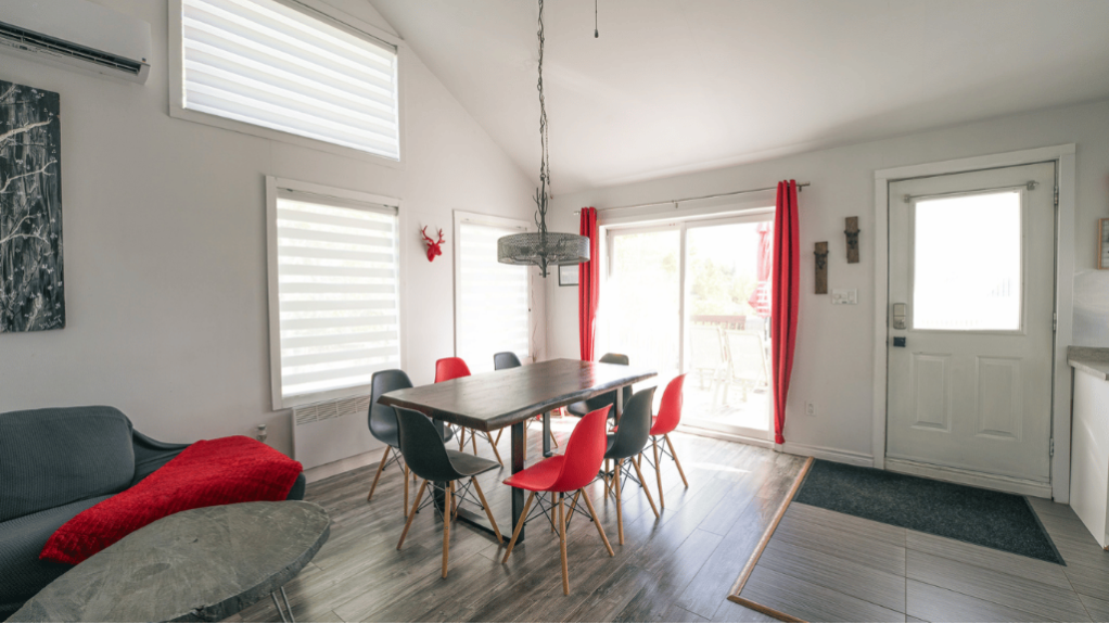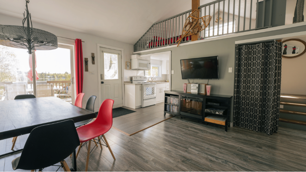 Le chalet est spacieux, lumineux et entièrement aménagé pour offrir tout le confort nécessaire durant votre séjour. La cuisine fonctionnelle est équipée avec électroménagers, vaisselle et tout le nécessaire pour préparer vos repas. La salle à manger conviviale permet de partager de bons moments autour de la table après une journée d’activités.