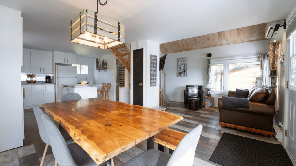 Le chalet est spacieux, lumineux et aménagé pour offrir tout le confort nécessaire durant votre séjour. La cuisine entièrement équipée comprend électroménagers, vaisselle et tout le nécessaire pour préparer vos repas. La salle à manger conviviale permet de partager de bons moments autour de la table après une journée d’activités.